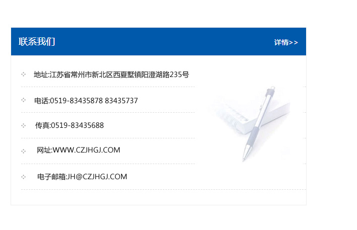地址:常州市新北區友邦商務大廈1幢16、17層  電話:0519-85101652  傳真:0519-85112595  郵編:213022  網址:www.cz-jiayue_cn.jxscfw.com  郵箱:xiajifengaa@163.com